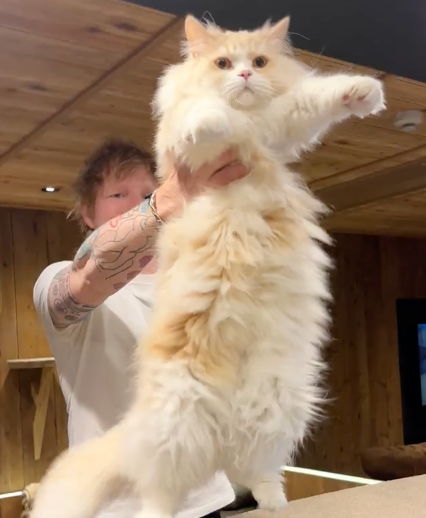 O britânico também é um notório fã felino. Quem acompanha a movimentada vida do cantor nas plataformas digitais será presentado com imagens como essa, onde um peposo Mainecoon é agarrado por Ed bem ao estilo “amor Felícia”.