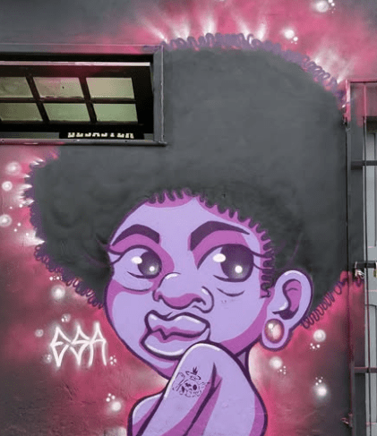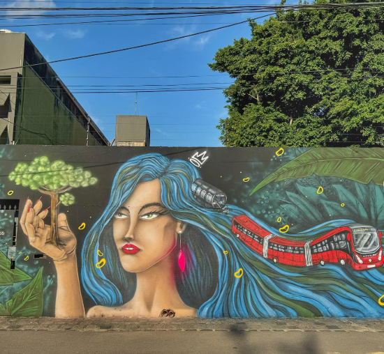 Acreana, 25 anos, grafiteira e produtora, traz em seus trabalhos e projetos sua raiz ribeirinha junto com o movimento urbano, retratando a cultura e a vivência nortista, além do elemento contemporâneo de rua.