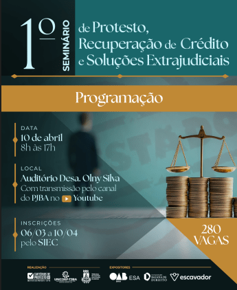 Assunto presente na rotina dos brasileiros, o endividamento e as soluções para a obtenção desses valores devidos será tema debatido entre profissionais do Direito. Nesta quinta (10), a capital baiana sediará o 1º Seminário de Recuperação de Crédito e Soluções Extrajudiciais, a partir das 8h, no auditório Desembargadora Olny Silva, localizado no TJBA (CAB).