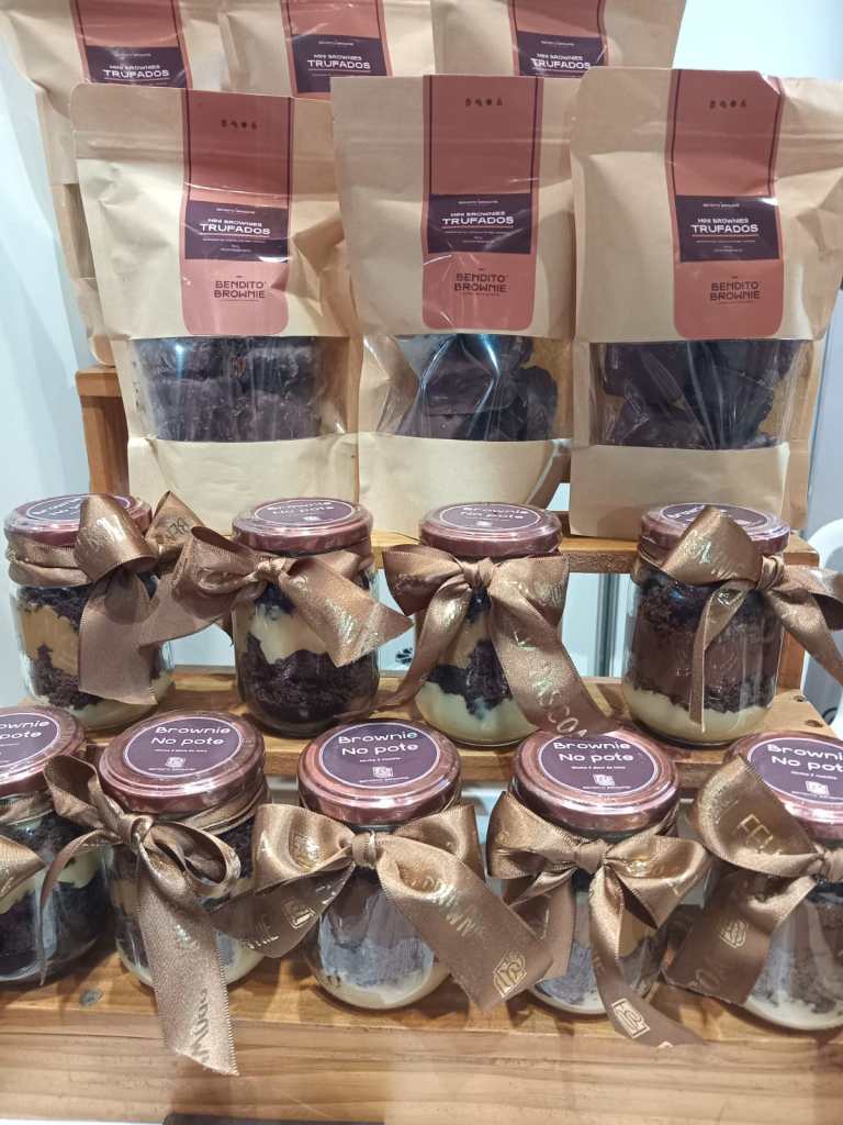 O concorrido espaço da Bendito Brownie, de Ilhéus, abrigava consumidores de varejo e lojas que queriam comercializar os elegantes produtos da marca. Além dos brownies embalados um a um, nas opções normal, sem açúcar ou recheado, o queridinho de quem passava era a versão do doce no vidro.