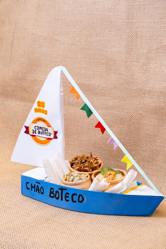 A chef Emanuele Nascimento conta qual foi a inspiração para o petisco. “Como o boteco está no Rio Vermelho, eu quis homenagear o bairro, e trazer uma tríade do mar. Então é um barco que remete aos que levam as oferendas de Iemanjá”. Ela complementa, falando mais sobre o Rio Vermelho. “É o bairro que nos recebe, que nos acolhe”.