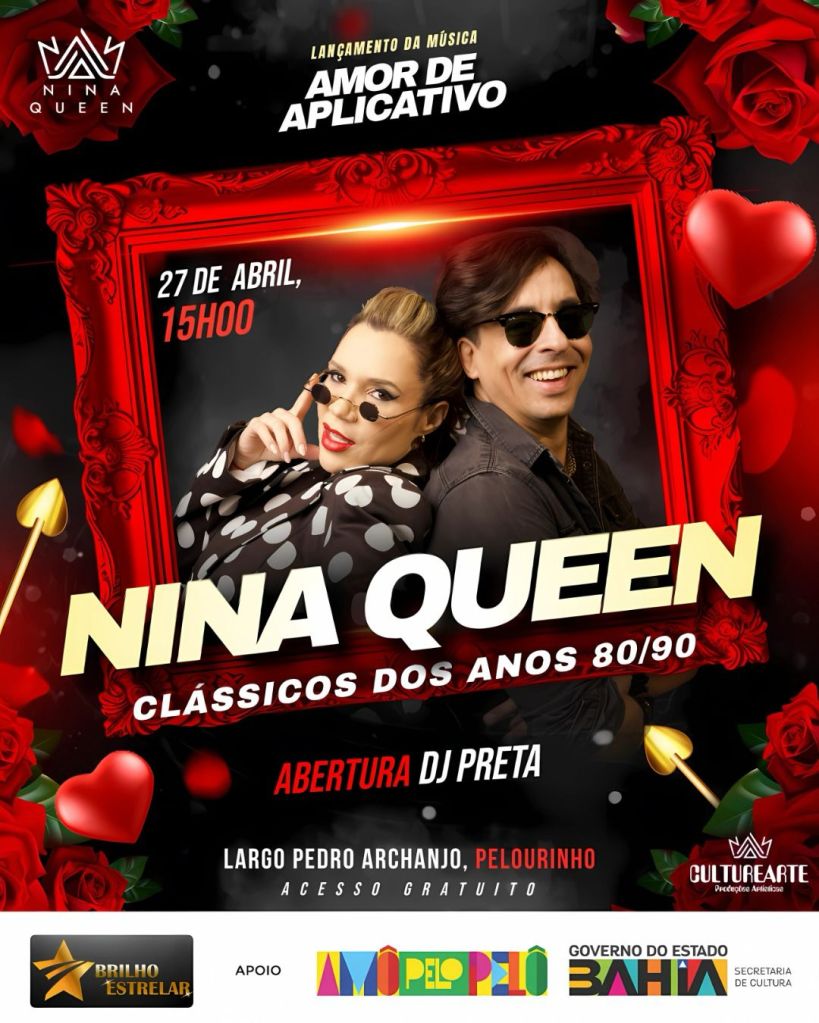 A cantora Nina Queen promete agitar a Praça Pedro Archanjo, no Pelourinho, com um show gratuito neste domingo (27), a partir das 15h. Conhecida por sua presença marcante e voz poderosa, a artista apresenta um repertório que mergulha nos grandes sucessos do pop, rock e dance dos anos 80 e 90, convidando o público para uma verdadeira viagem nostálgica.