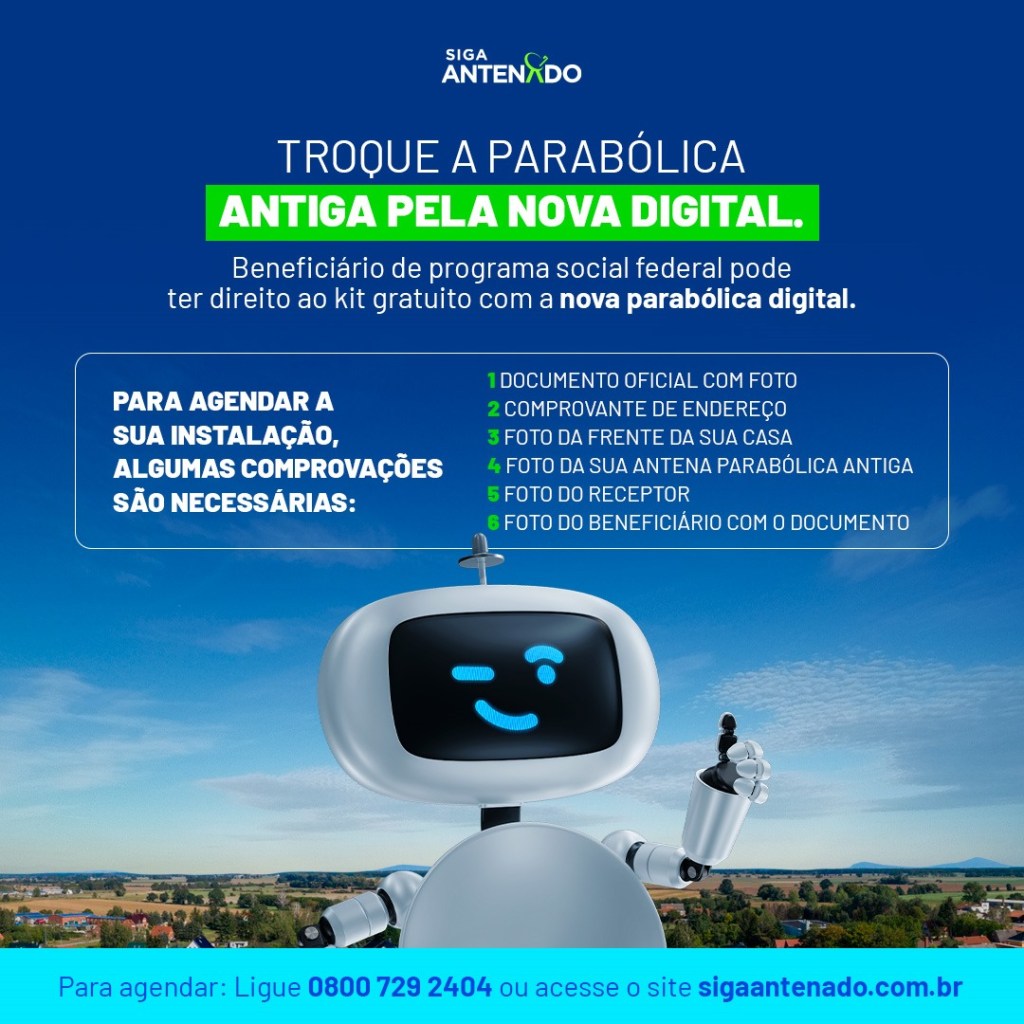 Os beneficiários de programas sociais do Governo Federal (através do CadÚnico) e que têm em casa uma parabólica tradicional são elegíveis para a substituição gratuita. Para isso, basta entrar em contato com a Siga Antenado através do site ou fazer uma ligação gratuita para 0800 729 2404. Esse número também recebe mensagens de texto via WhatsApp. Lembrete: é fundamental ter em mãos o número do CPF ou do NIS, pois esse dado será solicitado pelo atendimento da Siga Antenado.