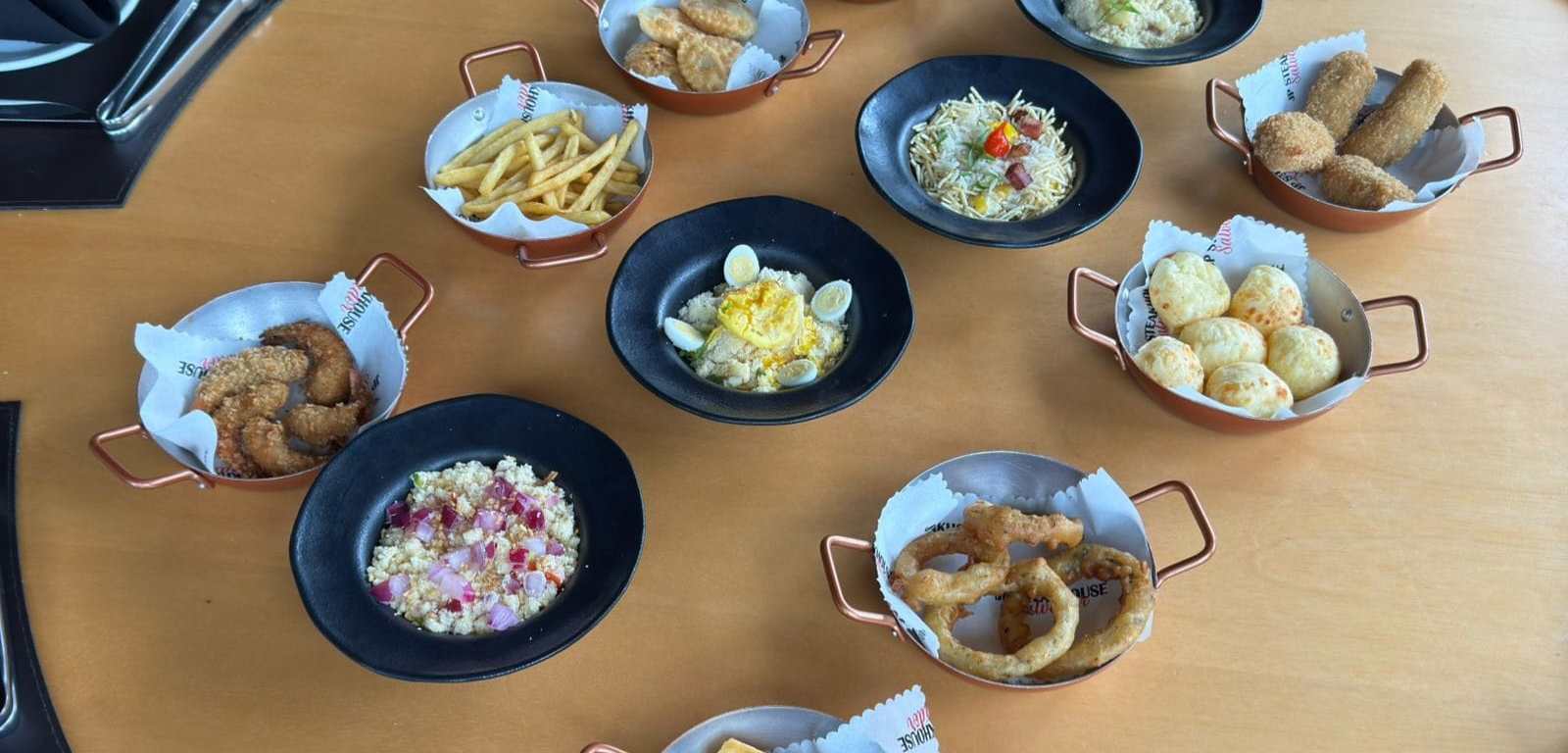 Nas entradas, o cliente pode optar entre pastel de carne ou queijo, camarão empanado ou cebola empanada, buffet de saladas com mais de 10 opções ou queijos parmesão, gruyere, gorgonzola e provolone.