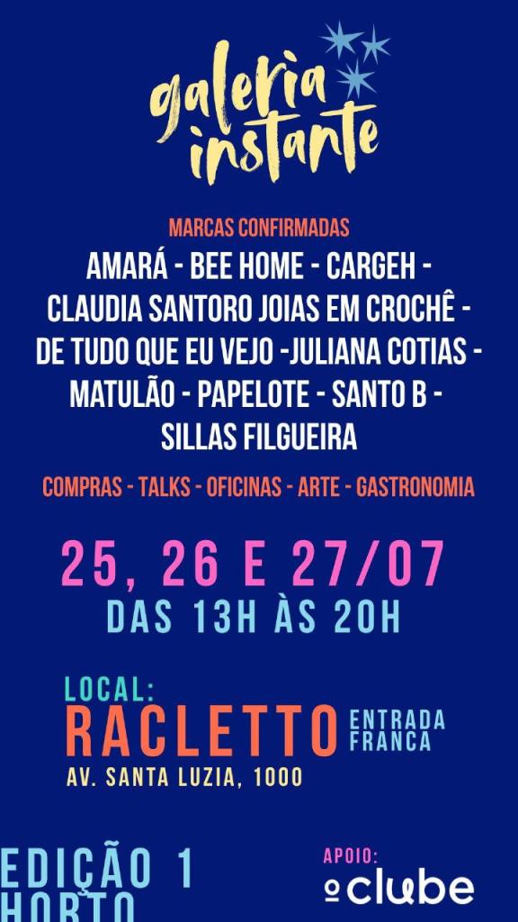 Nos dias 25 a 27 de julho (sexta a domingo), das 13h às 20h, acontece a primeira edição da Galeria Instante, projeto itinerante criado por Gabriela Cruz e Liu Falcão, responsáveis também pelo Mercado do Tira, que movimentou o Palacete Tirachapéu em junho. A feira será no restaurante Racletto (Horto) e une marcas autorais de moda, acessórios, lifestyle e arte – uma oportunidade para o público adquirir peças e roupas com muito estilo e participar de talks e oficinas. A entrada é franca e o evento tem o apoio de O Clube.