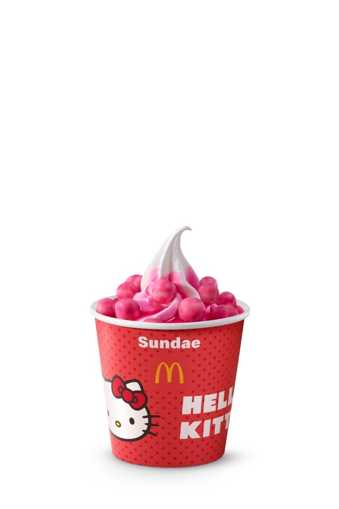 As novas sobremesas trazem a estética única da personagem para conquistar tanto no visual quanto no paladar. Os novos Sundae, Top Sundae e McColosso Hello Kitty são versões superfofas dos queridinhos do cardápio, mas agora com toda a magia rosa da Hello Kitty e novos ingredientes. Os doces são uma combinação de bebida láctea sabor baunilha, uma camada de cobertura sabor tutti-frutti e confeitos rosas de tutti-frutti.