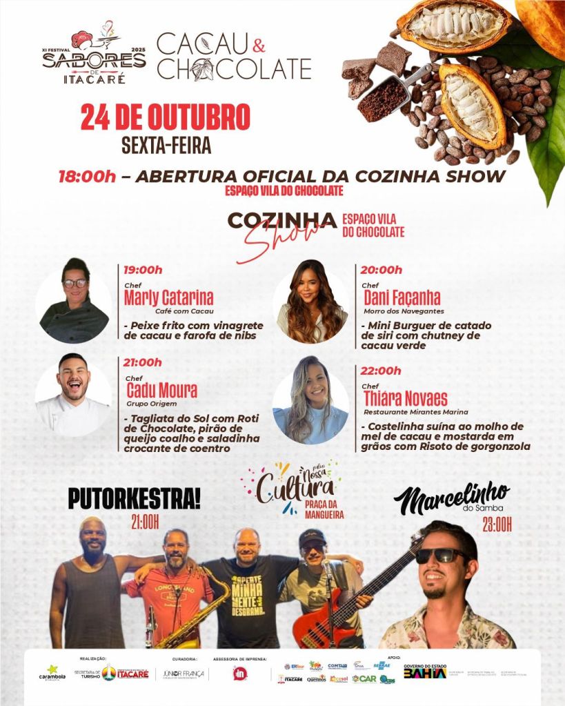 Começa nesta sexta-feira (24) vai até o domingo (26) a segunda fase da programação oficial do XI Festival Sabores de Itacaré. A edição do evento, que celebra o tema Cacau e Chocolate, já promoveu os lançamentos dos pratos e restaurantes participantes e agora oferece diversas atividades gratuitas no entorno da Praça da Mangueira, no município do litoral sul da Bahia. Para a ocasião, estão previstas a Cozinha Show, Vila do Chocolate, Feira Gastronômico e apresentações musicais.