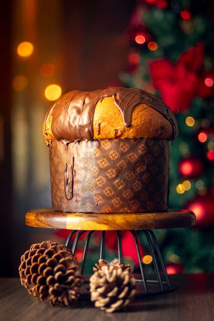 Panettone al Cioccolato – recheado com calda e gotas de chocolate belga Callebaut.