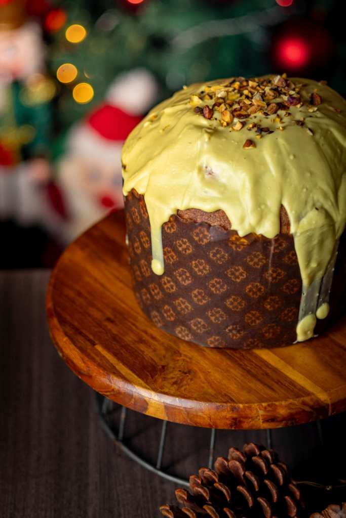 Panettone al Pistacchio – com generoso recheio cremoso de pistache com leite ninho e gotas de chocolate belga.