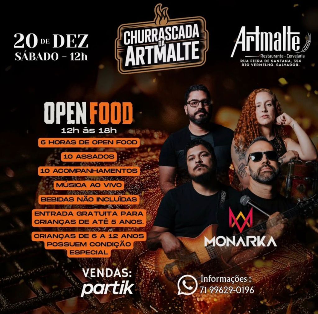 Das 12h às 18h, a Artmalte Restaurante e Cervejaria realiza uma experiência de seis horas de open food, reunindo 10 tipos de assados preparados no fogo e 10 acompanhamentos pensados para valorizar os sabores e a informalidade que o churrasco propõe. A programação inclui ainda música ao vivo com show da banda Monarka, reforçando a proposta de integração entre gastronomia e entretenimento.