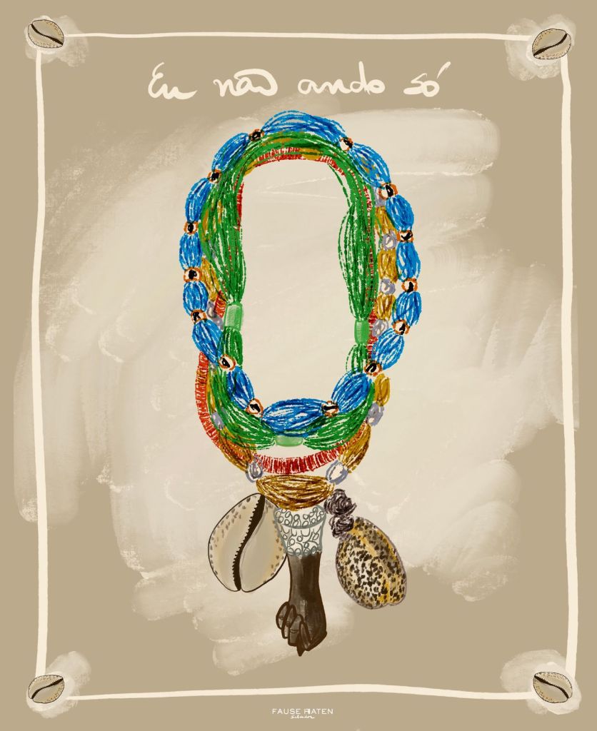 No local, Fause amplia seu repertório criativo e apresenta, pela primeira vez de forma estruturada, objetos para casa que dialogam diretamente com sua produção artística. Entre os destaques estão os colares de parede e de mesa, peças de grande volume, únicos e exclusivos, que remetem às joias crioulas e aos balangandãs, agora reinterpretados como objetos decorativos. Pratos de madeira com frases e elementos dourados também integram a coleção, unindo artesanato, memória e poesia.
