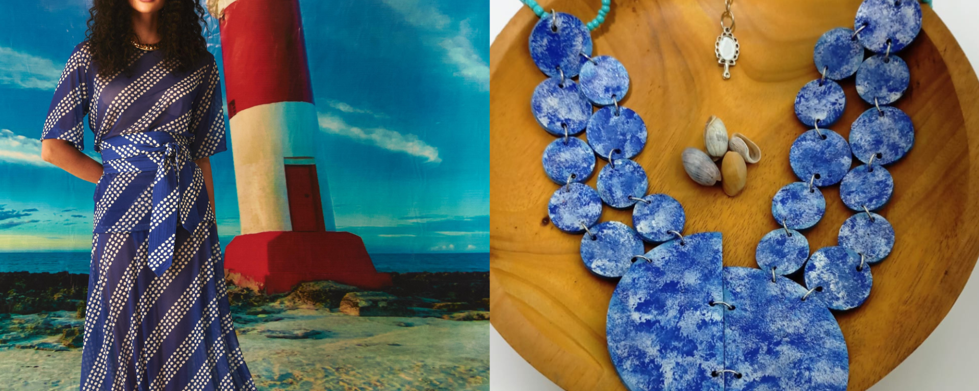 Produzidas em MDF com certificação de sustentabilidade, material que confere leveza aos adornos, as peças refletem um processo atento à materialidade e ao fazer manual. A marca DOMEU FLUIR, se destaca pelos brincos e colares pintados à mão com padronagens tribais e geométricas. Para o dia de Yemanjá, a marca aposta em peças com azul e branco em estampas pintadas a mao.