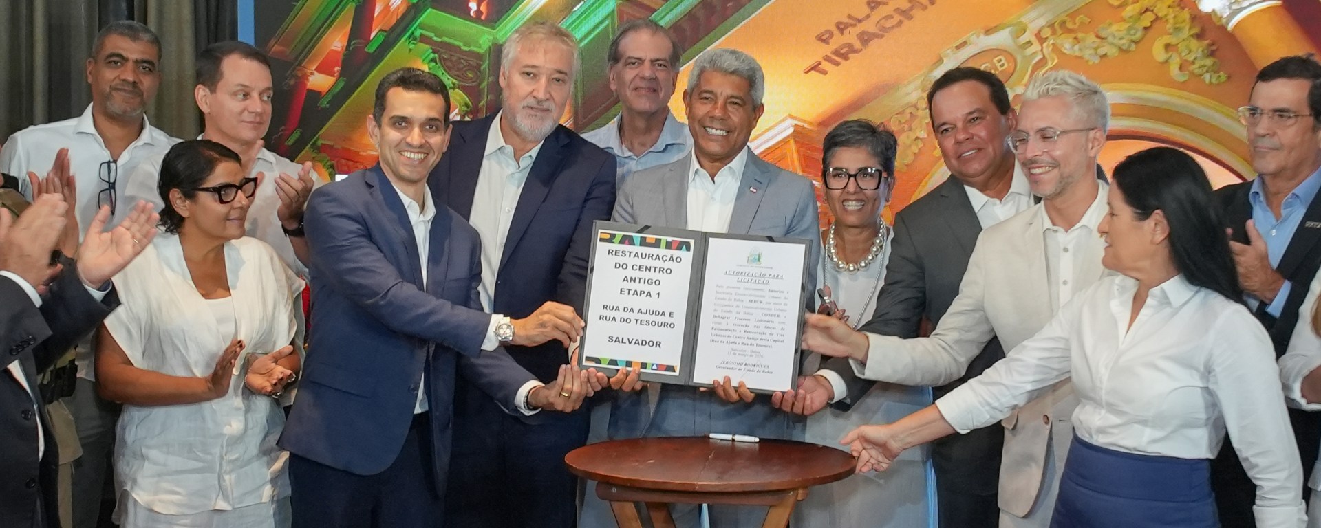 Nesta sexta-feira (13), o Palacete Tirachapéu recebeu o governador da Bahia, Jerônimo Rodrigues, o vice-governador, Geraldo Júnior, secretários de Estado, além de autoridades e lideranças empresariais que estiveram presentes na assinatura da Ordem de Serviço para a Requalificação da Rua da Ajuda e Rua do Tesouro.