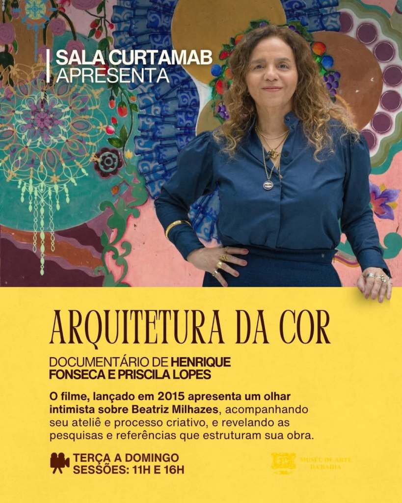 Além de conferir a exposição “100 Sóis”, de Beatriz Milhazes, no Museu de Arte da Bahia, o público tem mais uma opção para mergulhar no destacado trabalho da artista, reconhecida mundialmente por suas cores e formas. De terça a domingo, em duas sessões (11h e 16h), o MAB exibe o documentário “Arquitetura da Cor” (2015), de José Henrique Fonseca e Priscila Lopes.